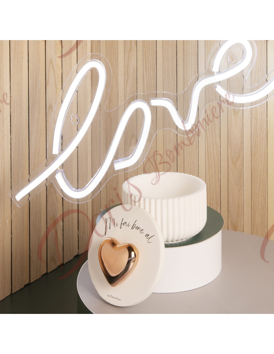 Diese mit Liebe zum kleinsten Details gefertigte Schachtel ist reinweiß und mit einem zart in Roségold applizierten Herzen auf dem Deckel verziert. Aufgrund seiner Abmessungen mit einem Durchmesser von 11,3 cm und einer Höhe von 6,5 cm eignet er sich ideal für die Aufbewahrung wertvoller Juwelen oder Gegenstände von sentimentalem Wert.