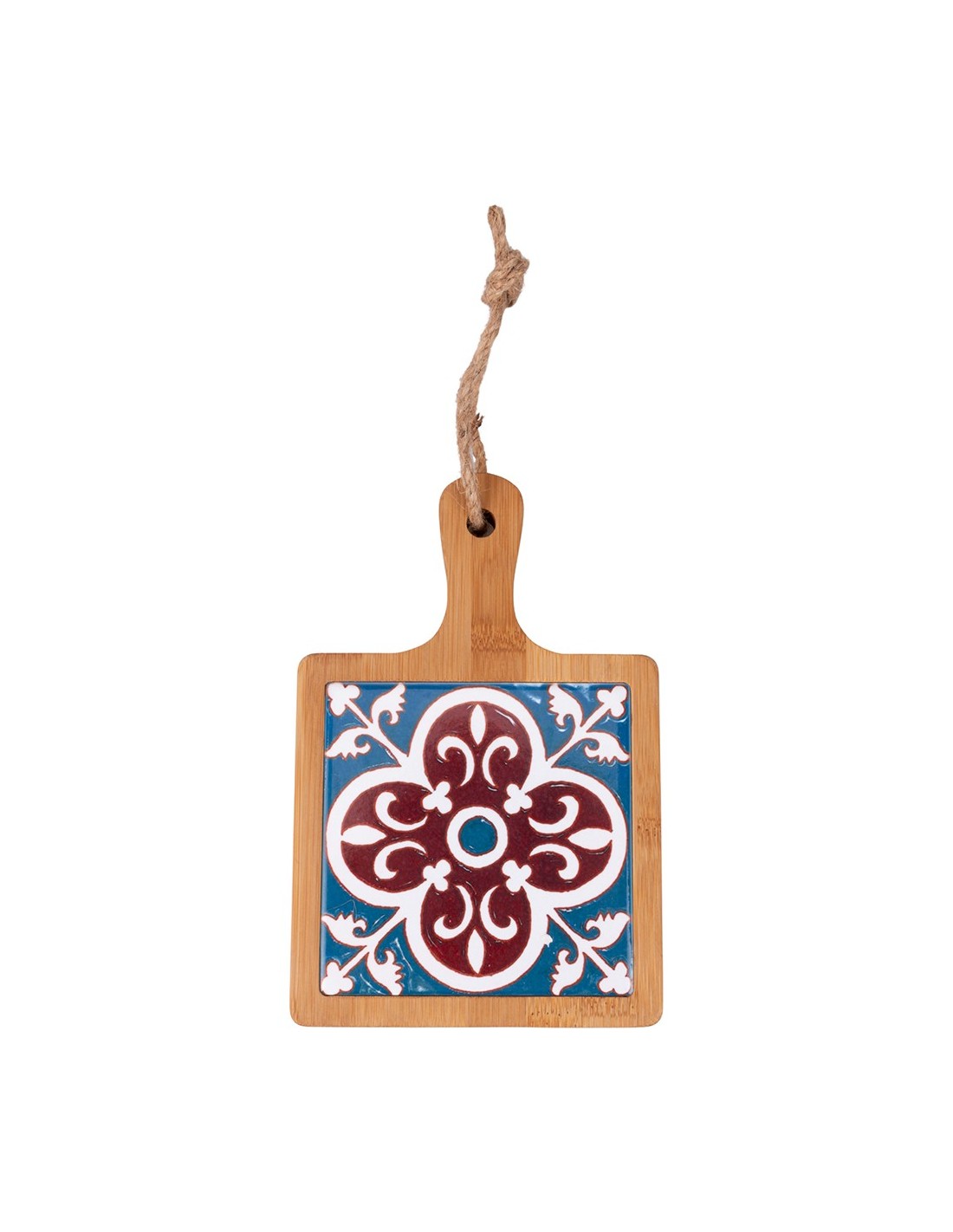Edles Holzschneidebrett mit dekorierter Fliese (19,5 x 13 cm). Ein praktisches und vielseitiges Accessoire, ideal zum Servieren von Vorspeisen, Käse, Wurstwaren und Snacks. Dank der Jutekordel lässt es sich auch als originelles Küchendeko-Accessoire aufhängen. Ideal als praktisches und preiswertes Geschenk für Hochzeiten, Jubiläen, Erstkommunionen und Firmungen – es vereint mediterranes Design, Funktionalität und Stil.