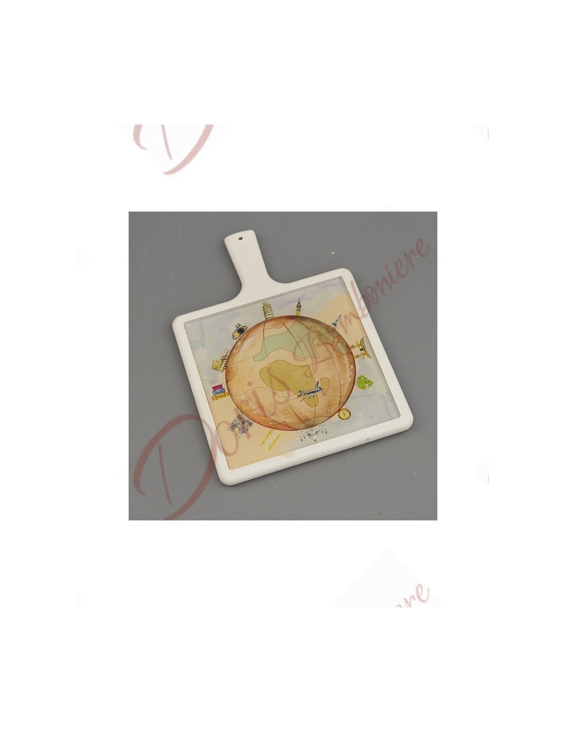 Nützliches Küchengeschenk mit weißem Holz und einem bedruckten Teil mit Reisemotiven auf Glas.