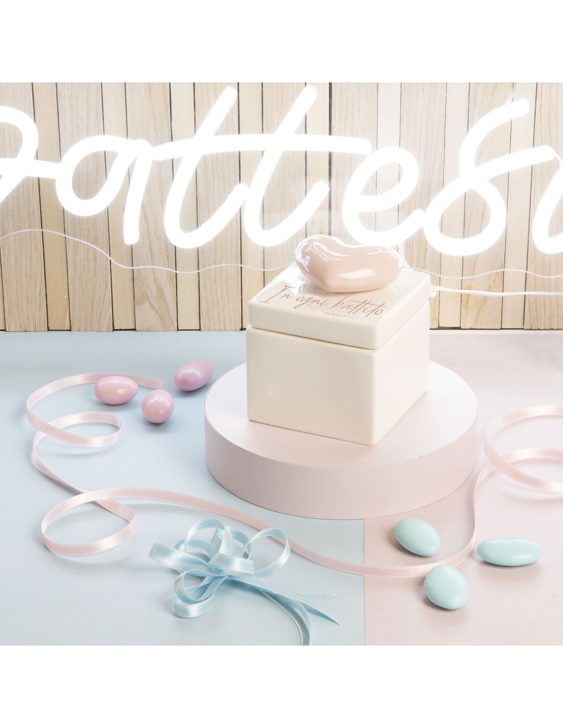 The porcelain jewelry box with pink heart for baptism 7.5x9 is an adorable and delicate option for a baptism or birth gift for a little girl. This wedding favor is made of porcelain and features a cute pink heart on top. It measures 7.5x9cm and comes with a gift pouch, making it ready for gift giving. This item is perfect for storing jewelery or small precious objects and will certainly be appreciated as a special keepsake for the baptism or birth of a baby girl. Claraluna favors collection 2024