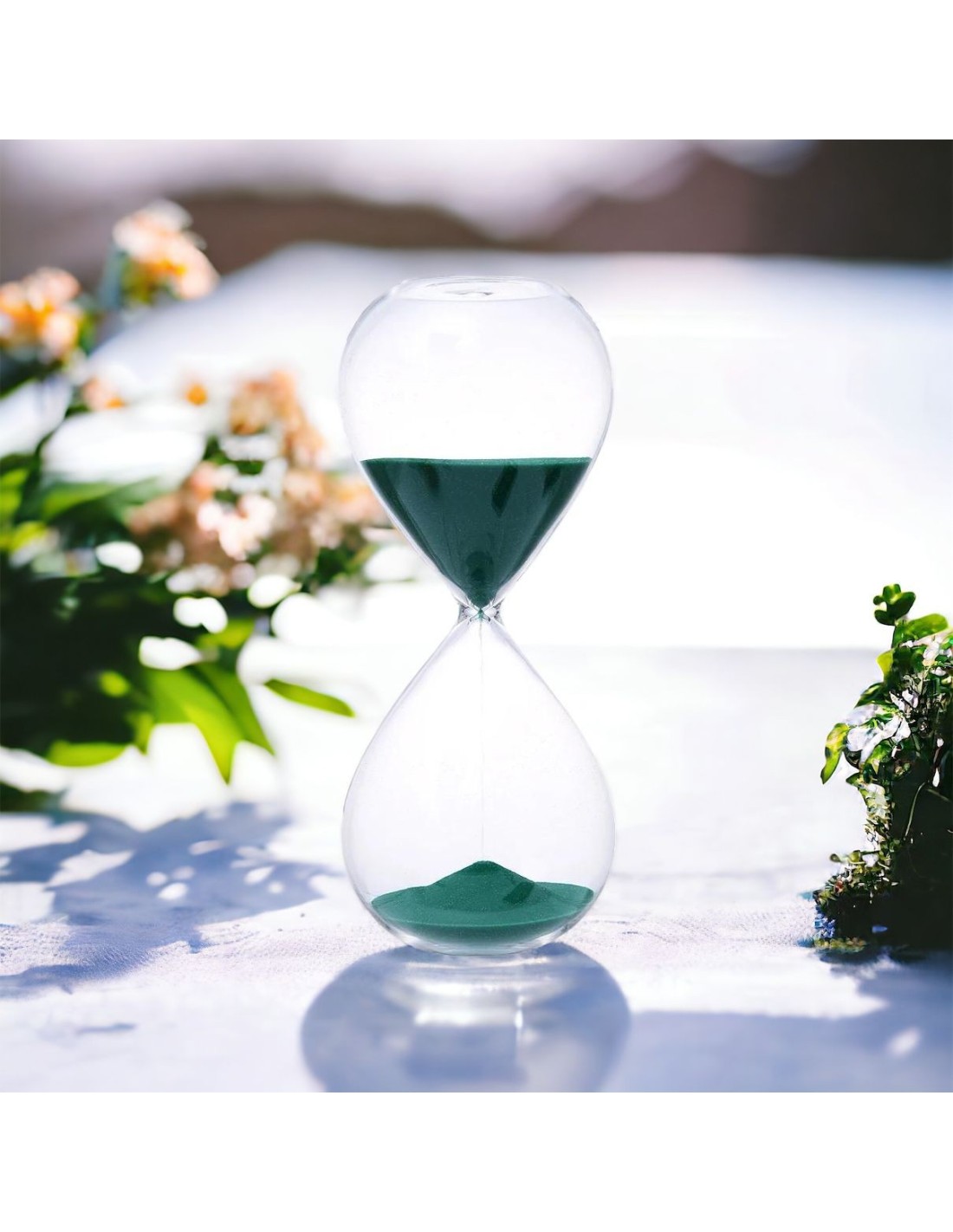 Glass hourglass favor with dark green sand 16.5 cm high 10 minutes is an elegant and unique option for special gifts or keepsakes. This hourglass is made of high quality clear glass and has dark green sand inside that slowly flows over a period of 10 minutes. With a height of 16.5 cm, this hourglass is a refined design object that can be used as a home decoration or as a gift for special occasions such as weddings, anniversaries or birthdays. Its elegance and the hypnotic movement of the sand make it a unique and fascinating option for anyone who wants to add a touch of class and originality to their gifts.