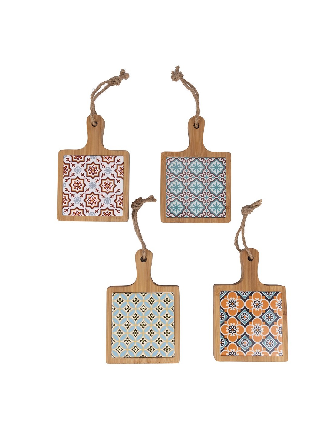 Refined wooden cutting board with decorative tile, available in 4 assorted colors. Measuring 19.5x13 cm, it's ideal as a useful, elegant, and affordable party favor, perfect for weddings, communions, confirmations, and anniversaries. Its Mediterranean design and practicality make it a popular and functional kitchen accessory. 👉 Price per piece; color/pattern is subject to availability.