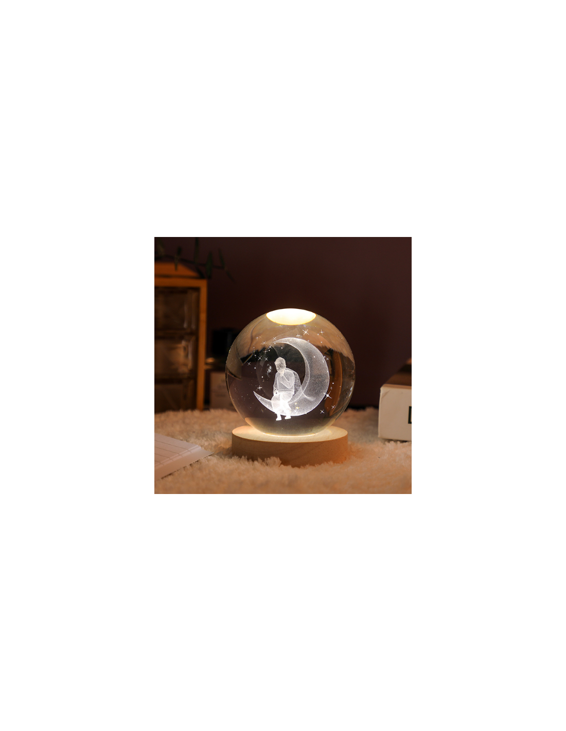 Prince on the Moon LED Lamp Favor, 8 cm – 3D Crystal Sphere with Wooden Base, USB