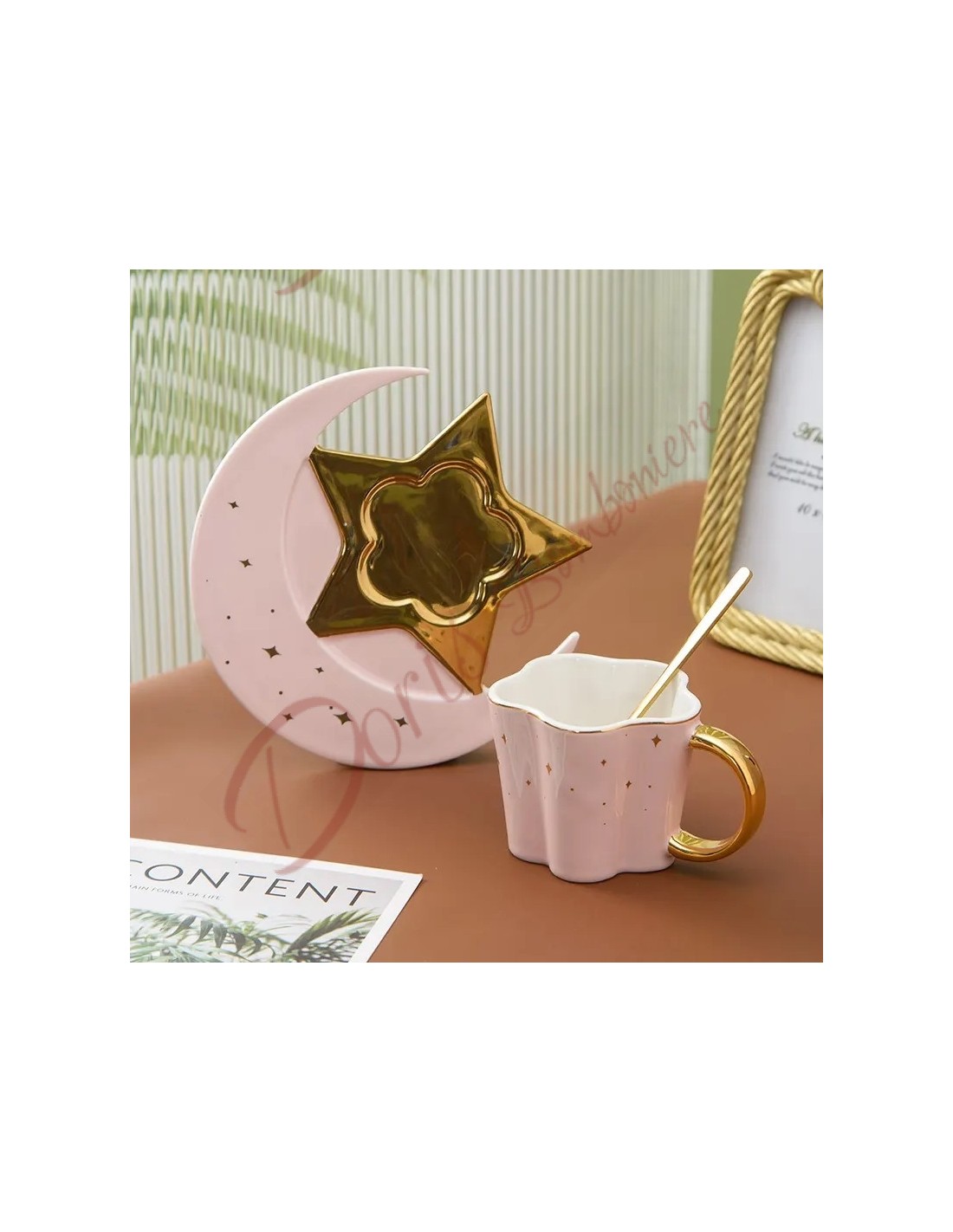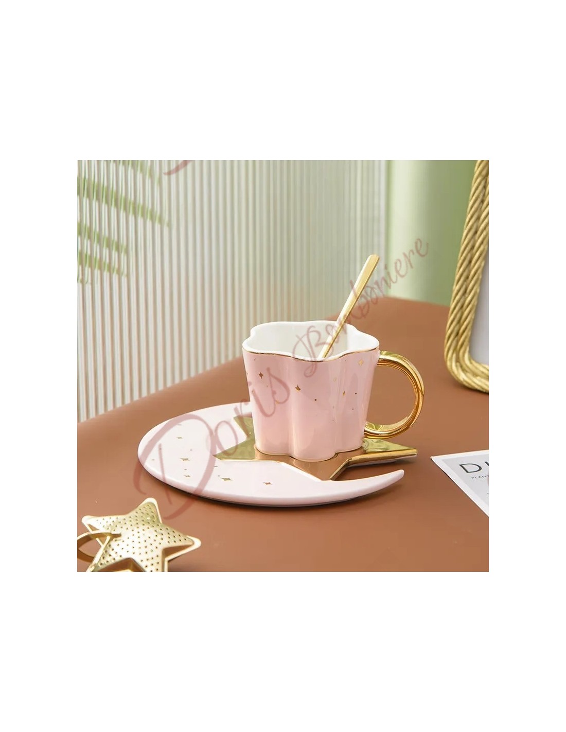 A charming star-shaped tea cup, with a gold moon and star saucer where the cup is placed, with a spoon. All made of fine colored glossy porcelain.