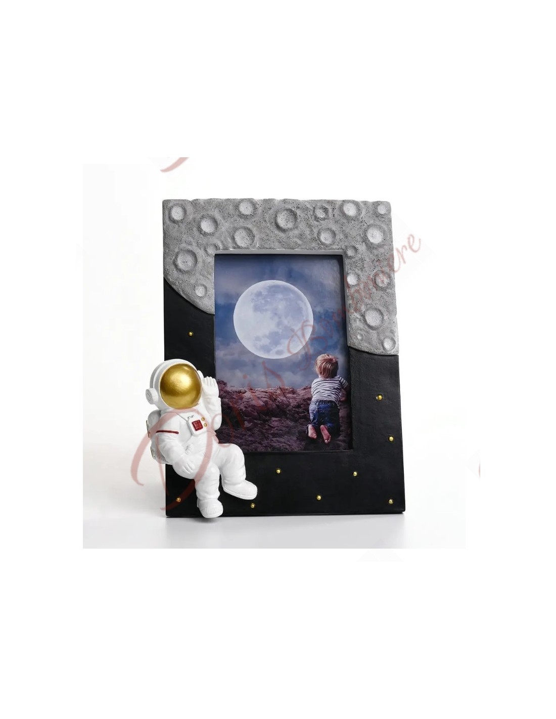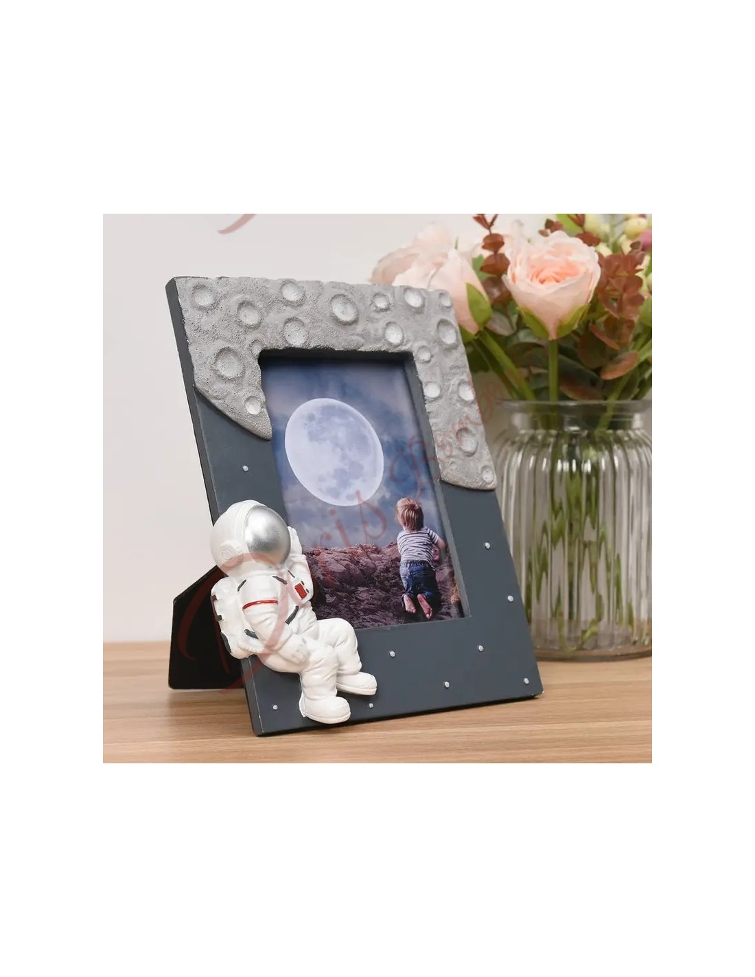 Astronomy-themed photo frame favors with astronaut and workmanship that recalls the moon and sky