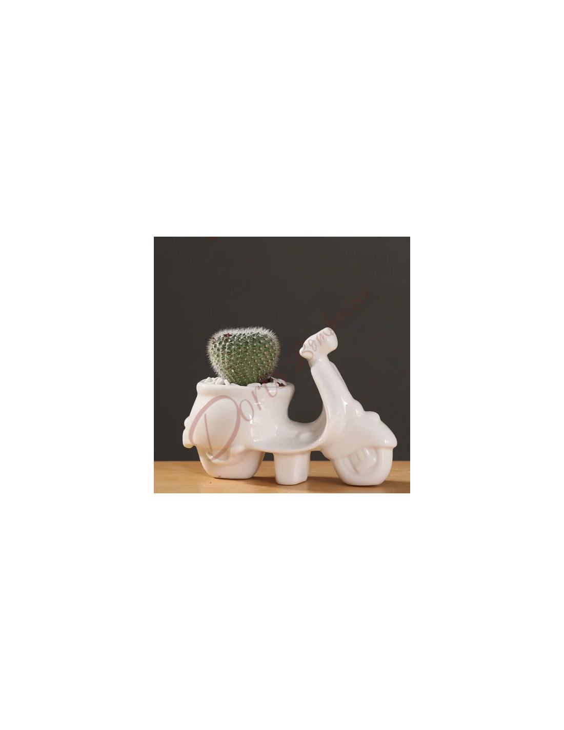 Bring a touch of greenery and charm to your space with this elegant wedding favor. We present a lovely white vase in the shape of a vespa motorbike ideal for all enthusiasts containing a fascinating seedling, the plants symbolize resistance and longevity. Perfect for decorating your home, office or as a gift for someone special.