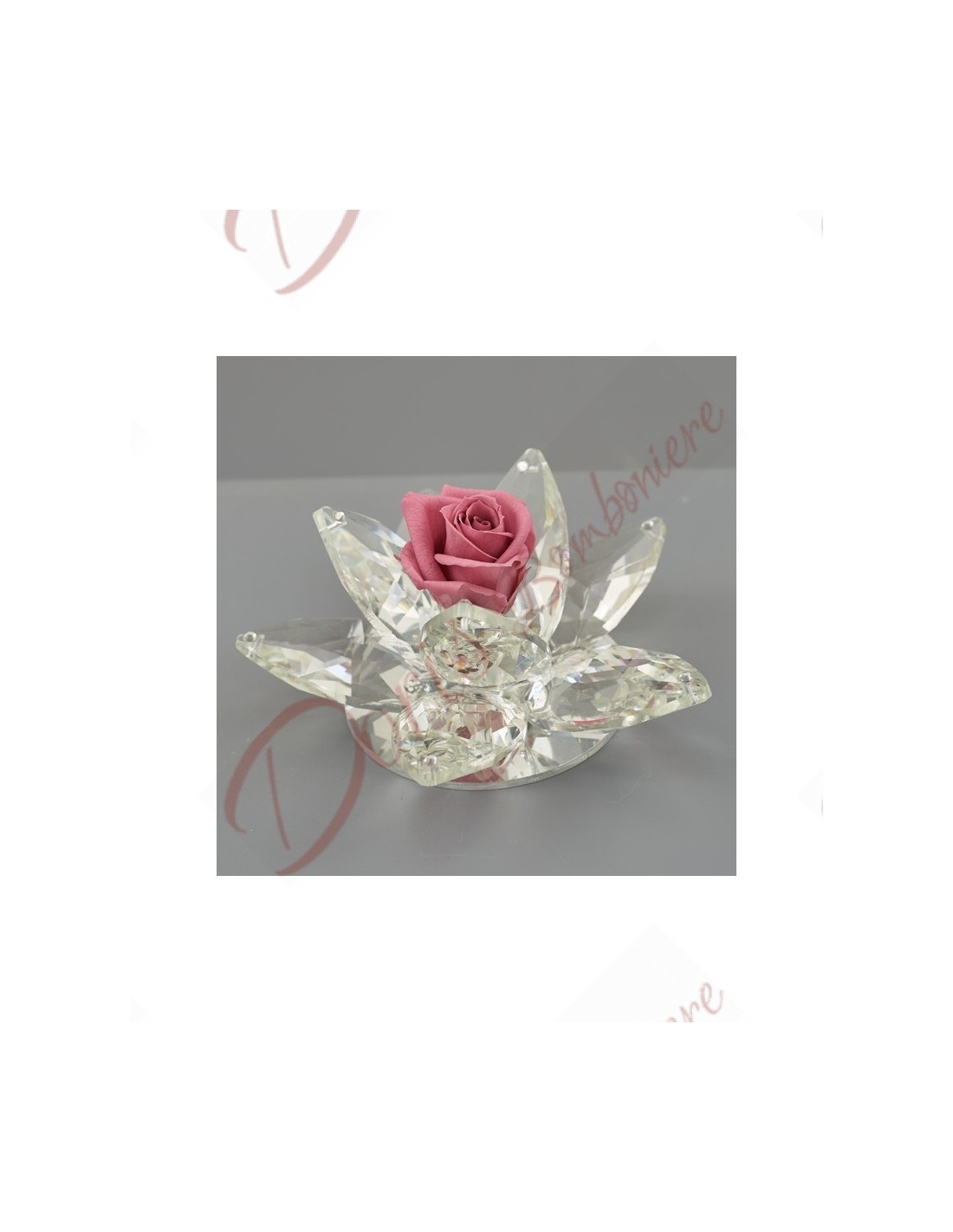 Bonbonnière en cristal à 8 pétales avec rose éternelle stabilisée de couleur vieux rose 13 cm avec boite led