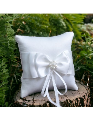 Coussin porte-bague en élégant satin blanc avec double nœud et application centrale de perles