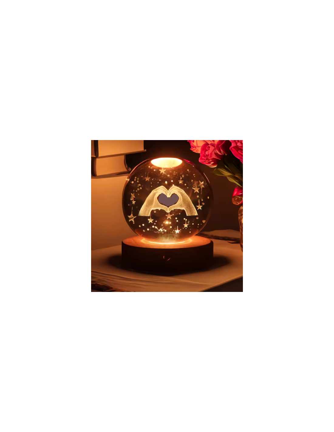 Un cadeau de mariage lumineux et émouvant : la sphère en verre de 8 cm contient la douce image de deux mains se joignant pour former un cœur, entouré d'un ciel étoilé. Montée sur un socle en bois raffiné, cette lampe LED décorative émet une lumière chaude et douce, idéale pour créer une atmosphère romantique et accueillante. Avec une taille globale de 8x8x10 cm, il se présente comme un cadeau de mariage moderne et utile avec une forte valeur symbolique. Parfait pour les mariages, anniversaires, communions ou confirmations, il laisse un souvenir lumineux et inoubliable dans le cœur.