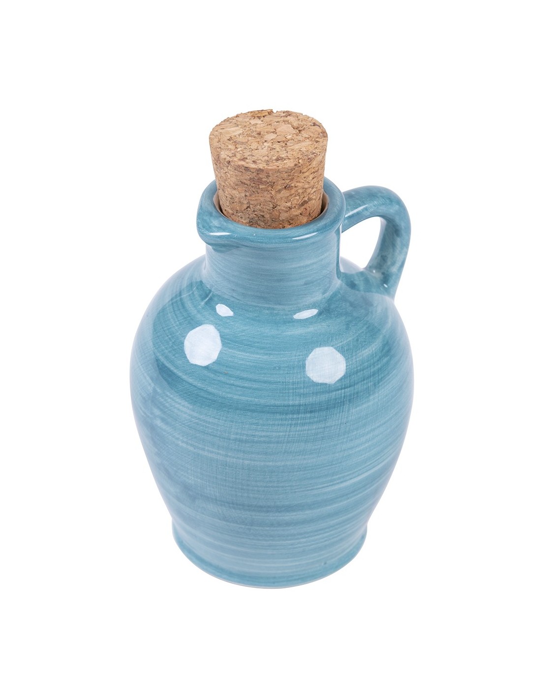 Élégante bouteille à huile amphore en céramique bleu sarcelle, avec bouchon en liège naturel, d'une capacité de 96 ml. Un accessoire pratique et abordable qui se transforme en cadeau de mariage moderne et abordable, parfait pour les mariages, communions, confirmations et anniversaires. Idéale pour contenir et servir de l'huile d'olive vierge extra, des liqueurs ou des condiments artisanaux, elle allie design méditerranéen et fonctionnalité pour un souvenir précieux.