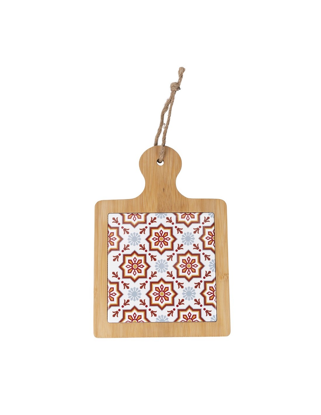 Élégante planche à découper en bois 29 x 20 cm avec motif carreau rouge, avec poignée et cordon de suspension en jute. Un accessoire de cuisine polyvalent et raffiné, idéal pour servir amuse-bouches, fromages et apéritifs avec style. Son design méditerranéen en fait également un accessoire de décoration idéal. Un choix original et abordable pour un cadeau de mariage, d'anniversaire ou de communion, alliant praticité et esthétique.