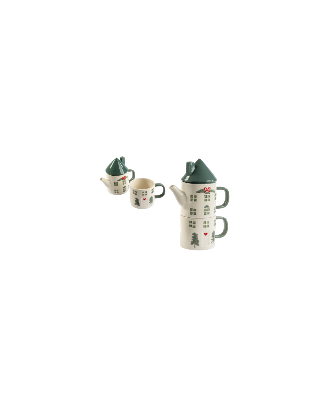 Réchauffez vos journées d'hiver avec cet ensemble théière et tasse en céramique de 24 cm de haut, en forme de maison de Noël avec sapins. Un accessoire de décoration élégant et fonctionnel, idéal pour déguster thé, tisanes ou infusions avec style. Son design original évoque l'ambiance de Noël avec ses détails de fenêtre, sa porte décorée et ses cœurs rouges qui créent une atmosphère chaleureuse et accueillante. Parfait comme cadeau de Noël, cadeau d'invité ou accessoire original pour décorer votre cuisine pendant les fêtes. Fabriqué en céramique durable, il allie praticité, esthétique et esprit de Noël.
