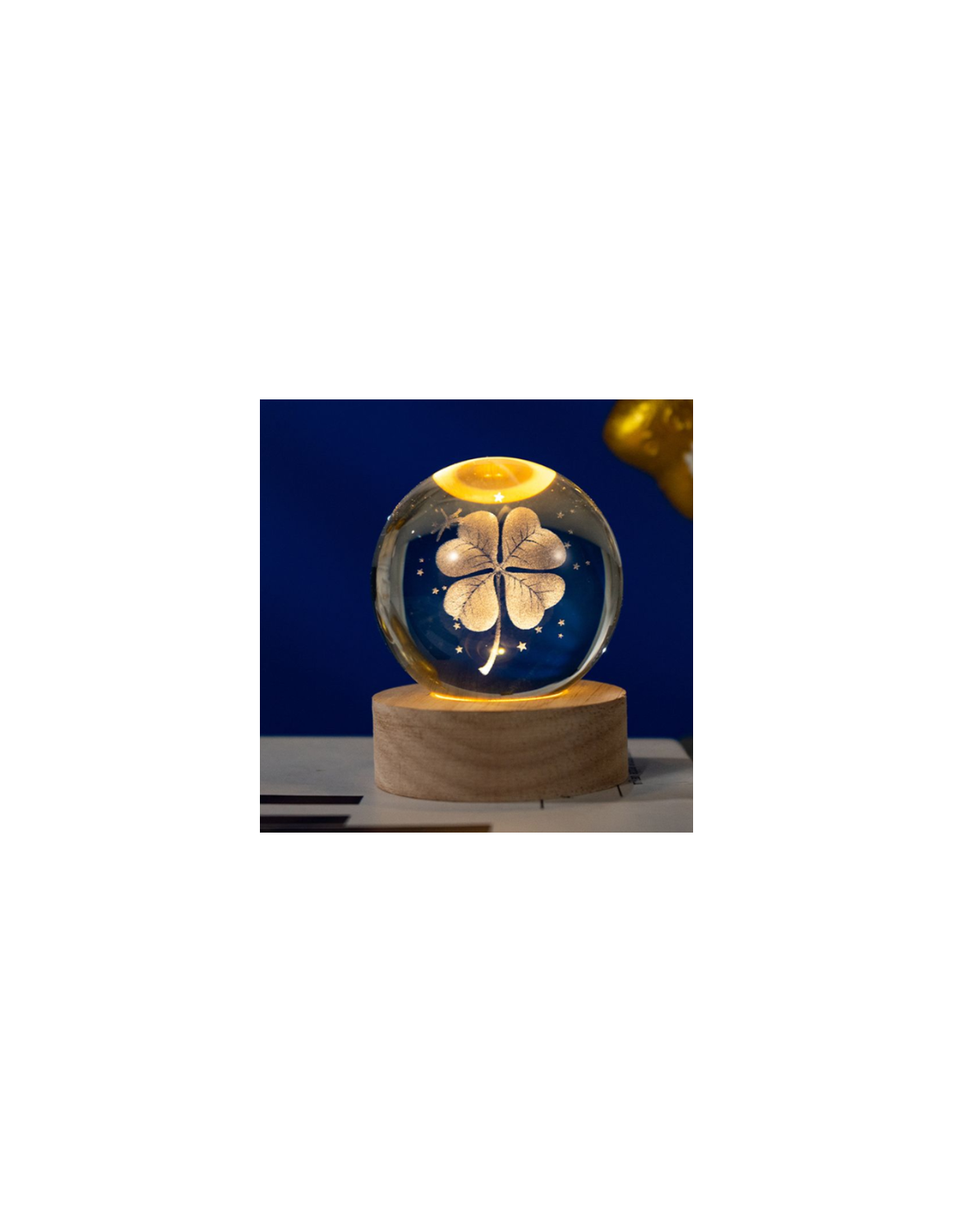 Lampe sphérique LED en cristal de 8 cm avec socle en bois orné d'un trèfle à quatre feuilles