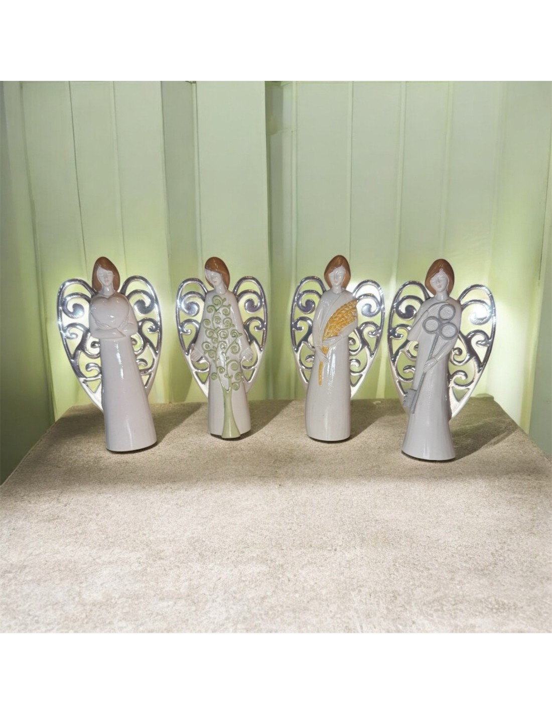 Anges décoratifs en résine brillante aux magnifiques ailes argentées, d'une hauteur de 12 cm. Disponibles en plusieurs modèles : ange aux mains jointes, ange avec un arbre, ange avec un épi de maïs, ange avec une fleur. Le contraste entre la robe en satin et les ailes argentées confère à chaque pièce une allure moderne et lumineuse. Parfaits comme cadeaux d'invités élégants, présents symboliques ou objets décoratifs raffinés.