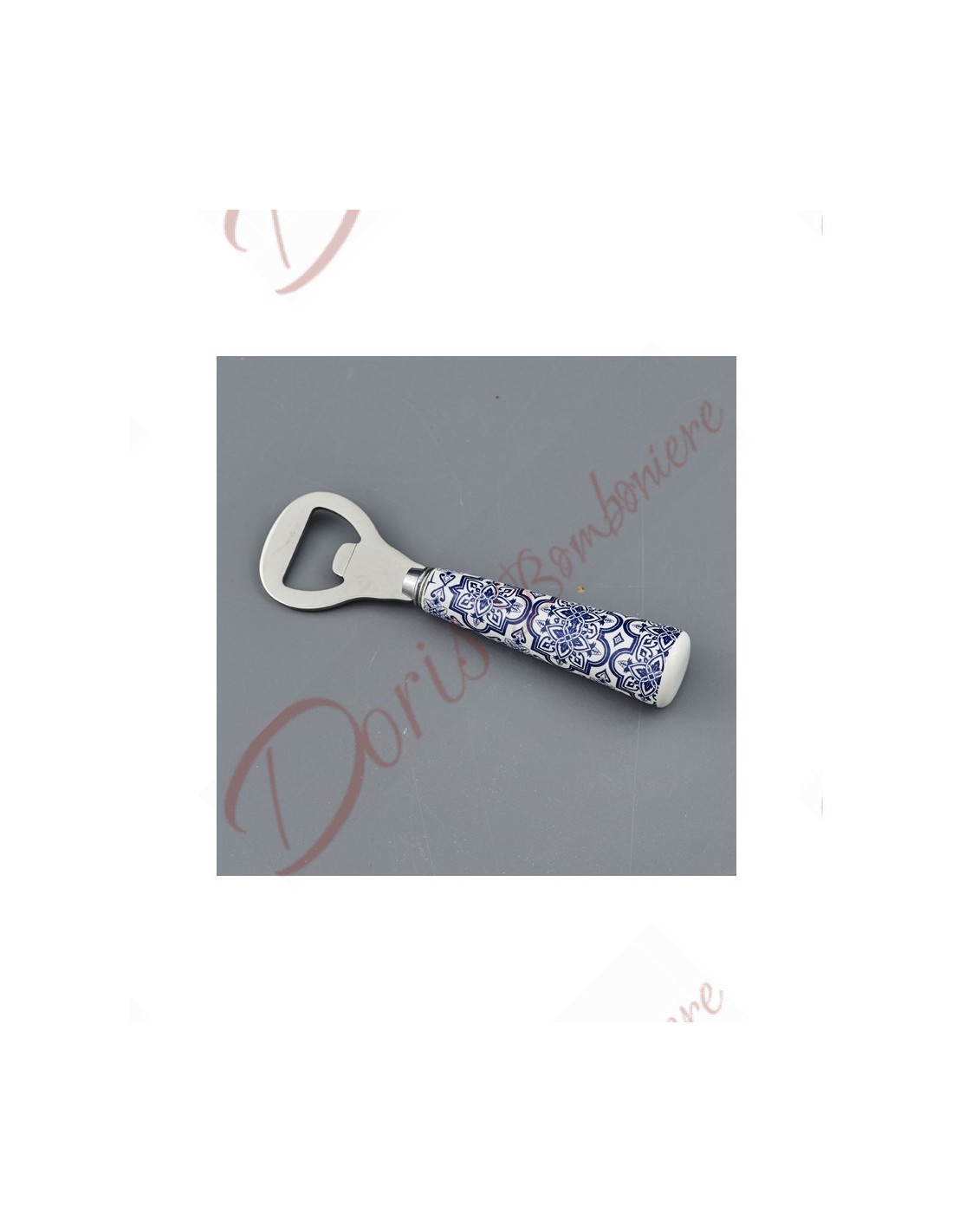 Ouvre-bouteilles utiles pour faveurs de mariage originales avec poignée en céramique de style majolique dans les tons bleus