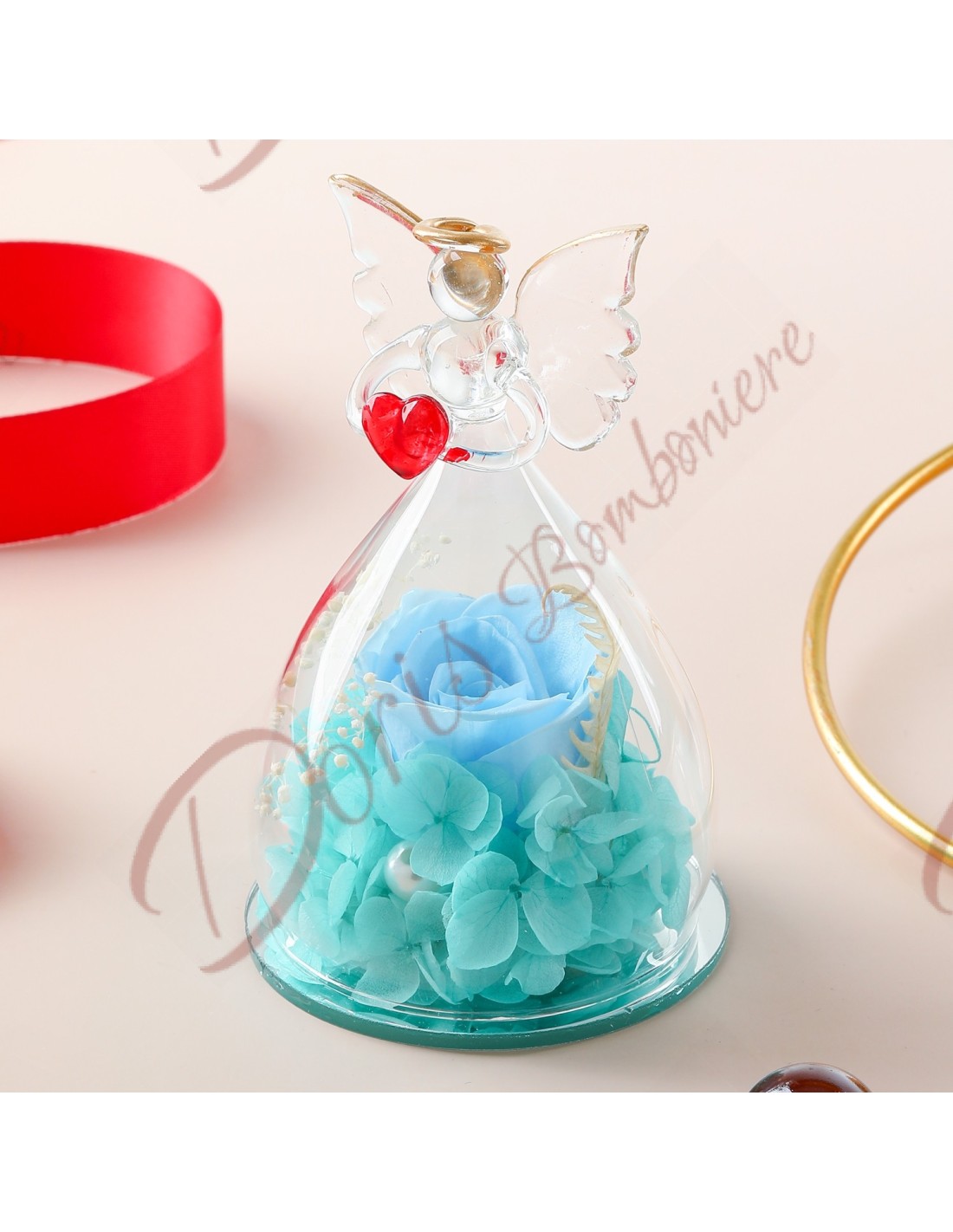 Bomboniere rosa stabilizzata con fiori colore AZZURRO racchiusi in angelo in vetro soffiato con cuore rosso cm 10x7