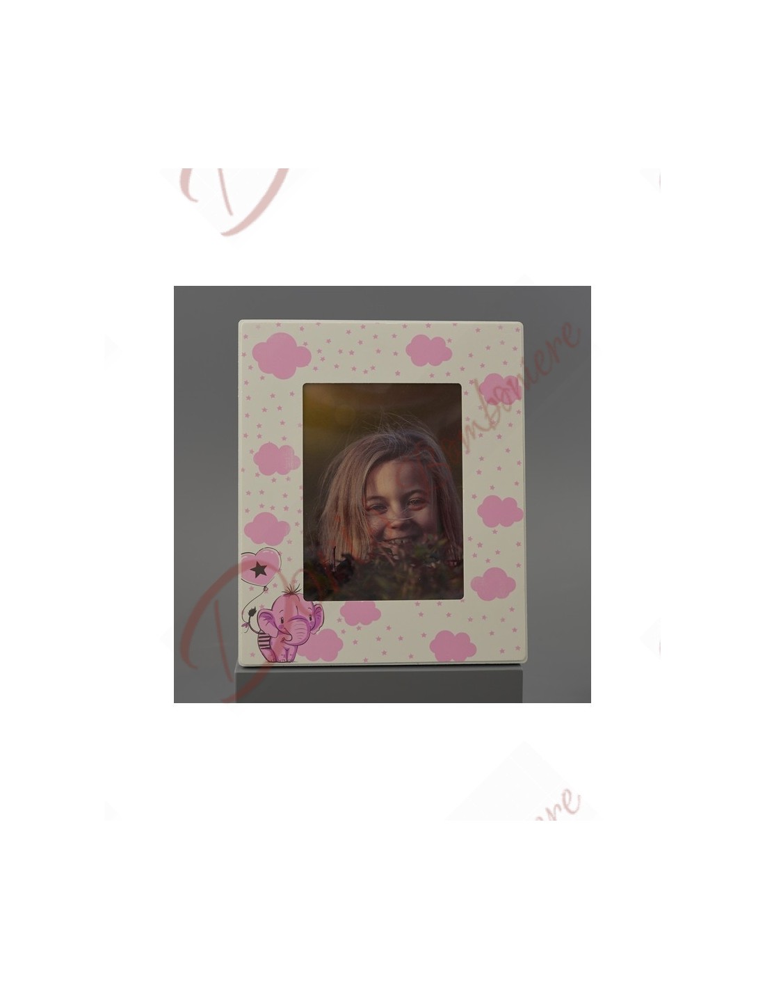 Bomboniera cornice porta foto con elefantino rosa verticale 22x27 (foto 15x20 cm)