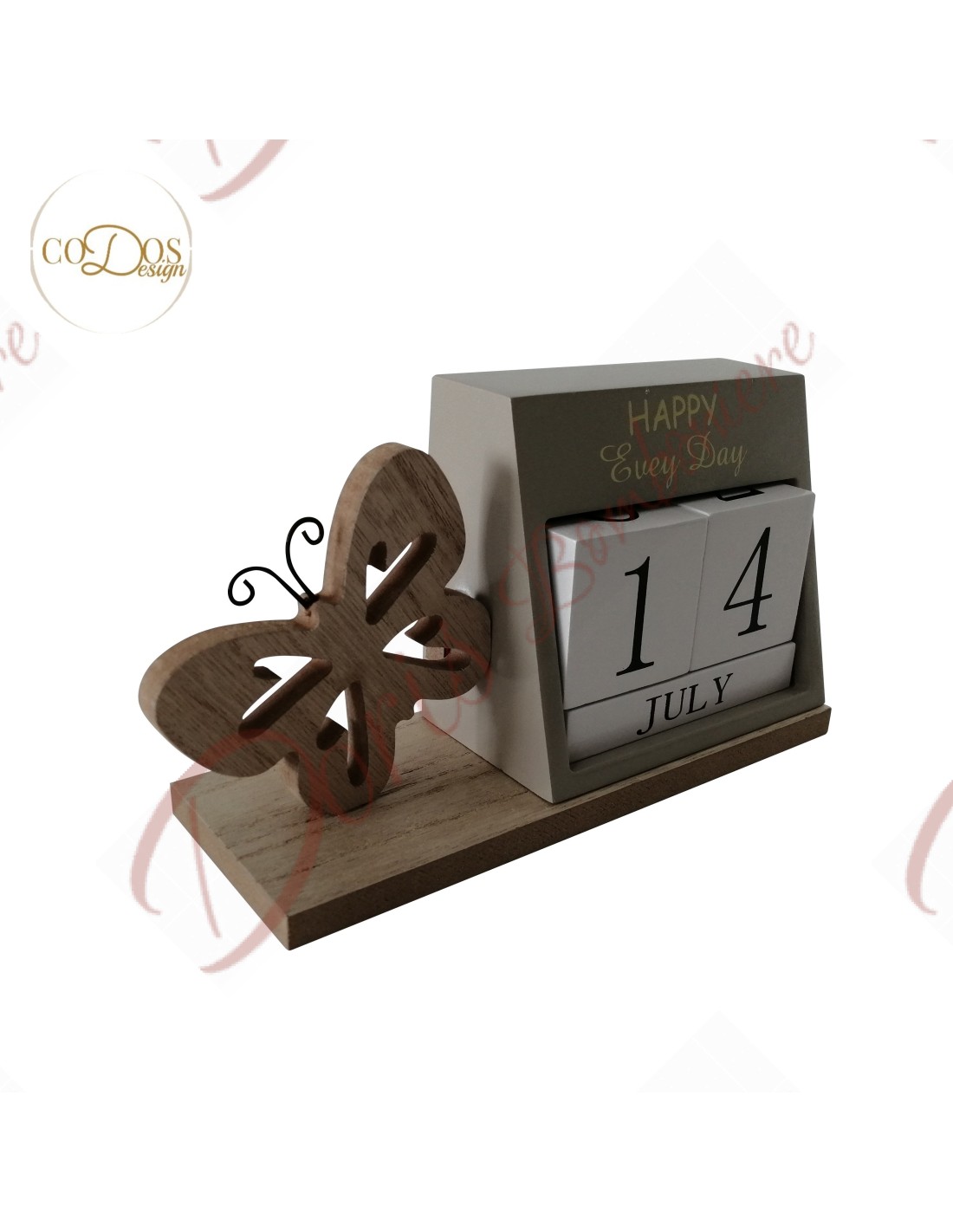 Questa bomboniera utile rappresenta un’idea originale e funzionale: un calendario perpetuo in legno impreziosito da una farfalla decorativa, simbolo di trasformazione e rinascita. Con le sue dimensioni di 18.5x6.5x10.5 cm, si adatta perfettamente a qualsiasi scrivania o angolo della casa.