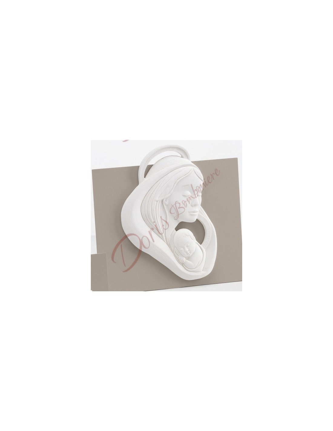 Bomboniere Madonna con bambino bianco luna con retro tortora in legno cm 23x23 con scatola
