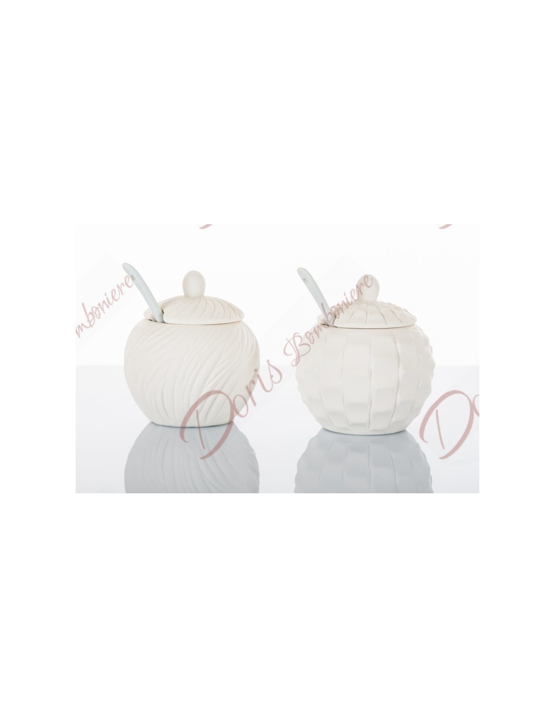 Dim. d10,5X12 zuccheriera piccola in ceramica con cucchiaino in due modelli assortiti. diametro 10,5 cm
