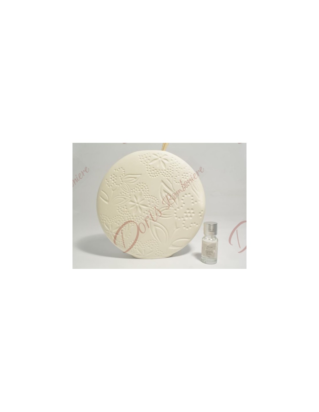 Vaso profumatore in porcellana biscuit bianca con decoro floreale completo di kit essenza,