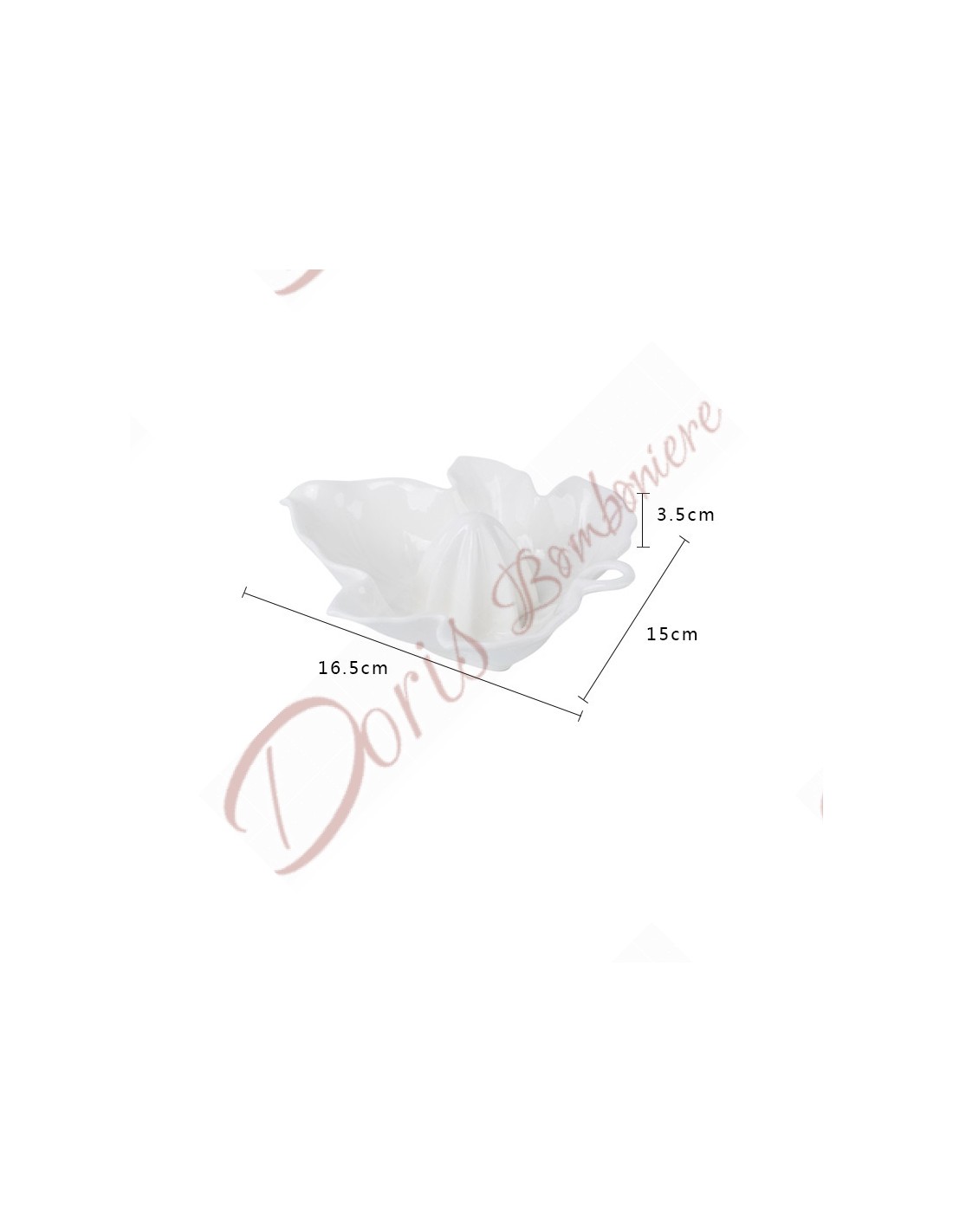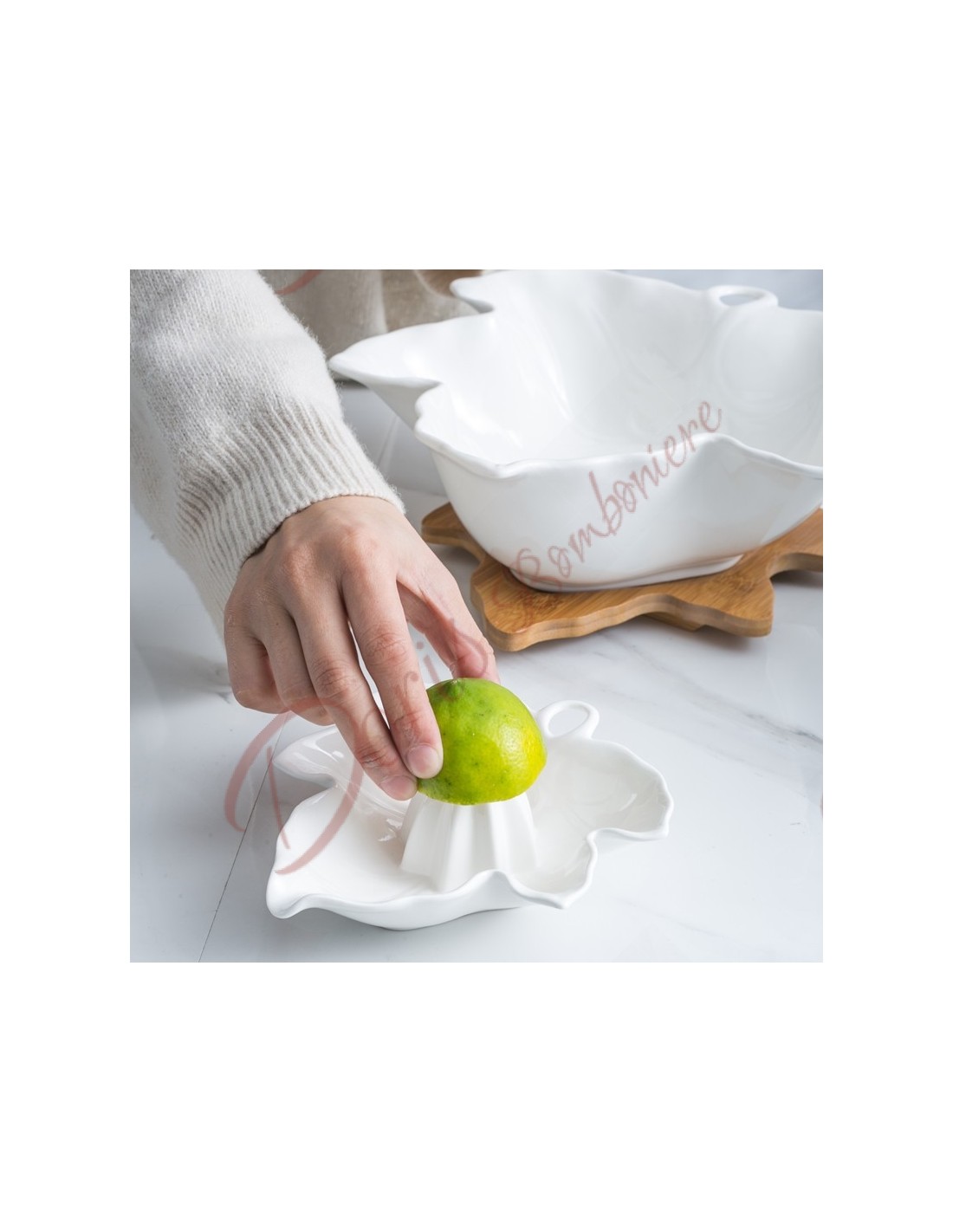 Questo spremiagrumi in porcellana bianca, dalla forma delicata a foglia, è una bomboniera originale e utile, pensata per chi desidera sorprendere gli ospiti con un oggetto raffinato e quotidianamente funzionale. Le dimensioni generose di 16.5x15 cm lo rendono perfetto per l'uso in cucina, mantenendo al tempo stesso un’estetica pulita e sofisticata.