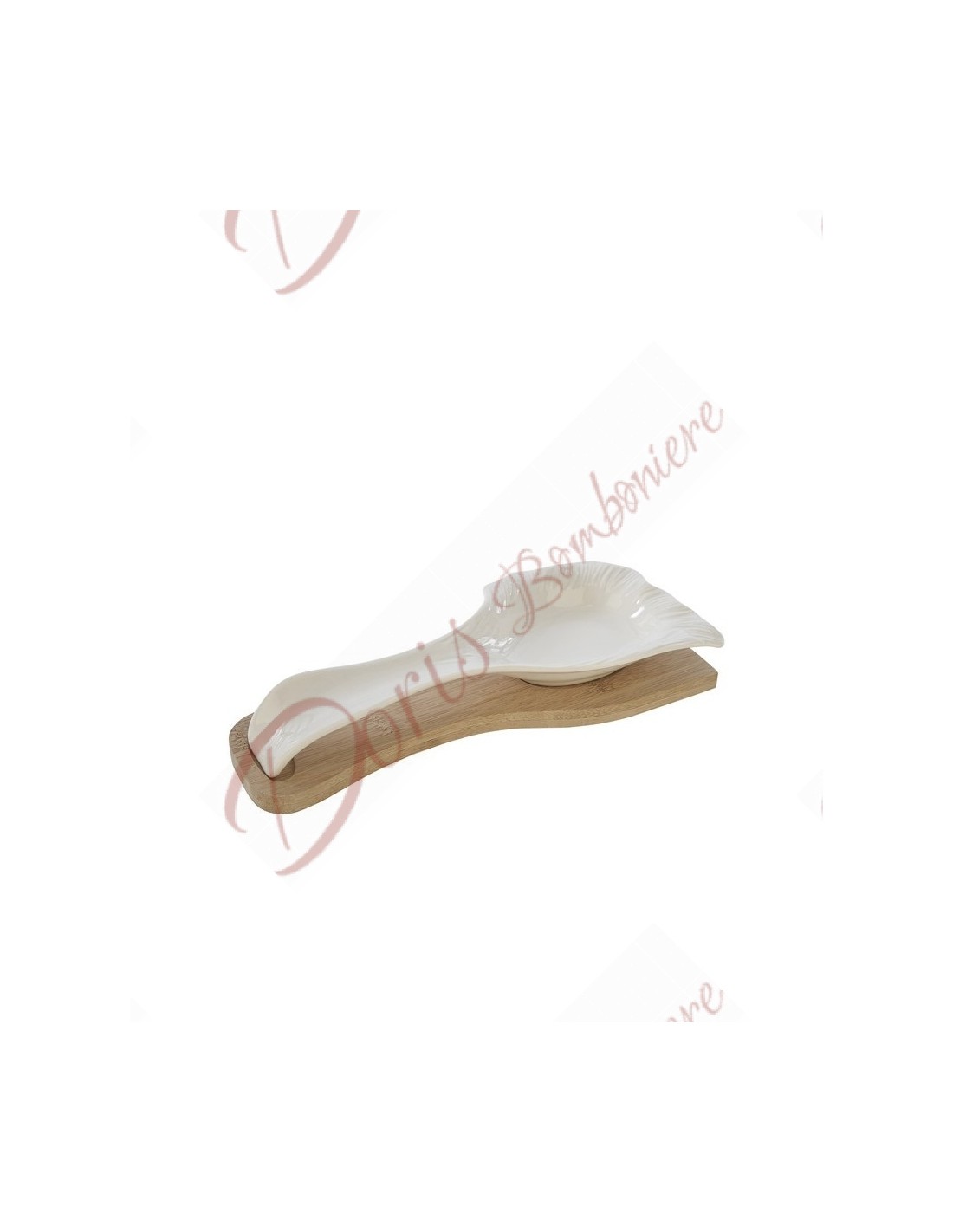 Bomboniera utile poggiamestolo in porcellana bianca con supporto in legno cm 24