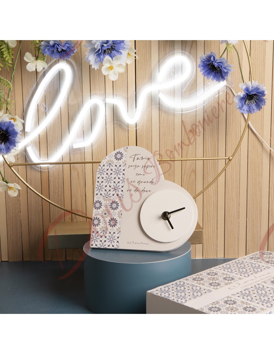 Approfitta dell'occasione speciale con la nostra esclusiva bomboniera orologio a forma di cuore con fantasia maiolica! Realizzato con cura e dettagli romantici, quest'orologio stampato su legno è un vero gioiello per celebrare il tuo matrimonio, anniversario di nozze o qualsiasi altra ricorrenza significativa.