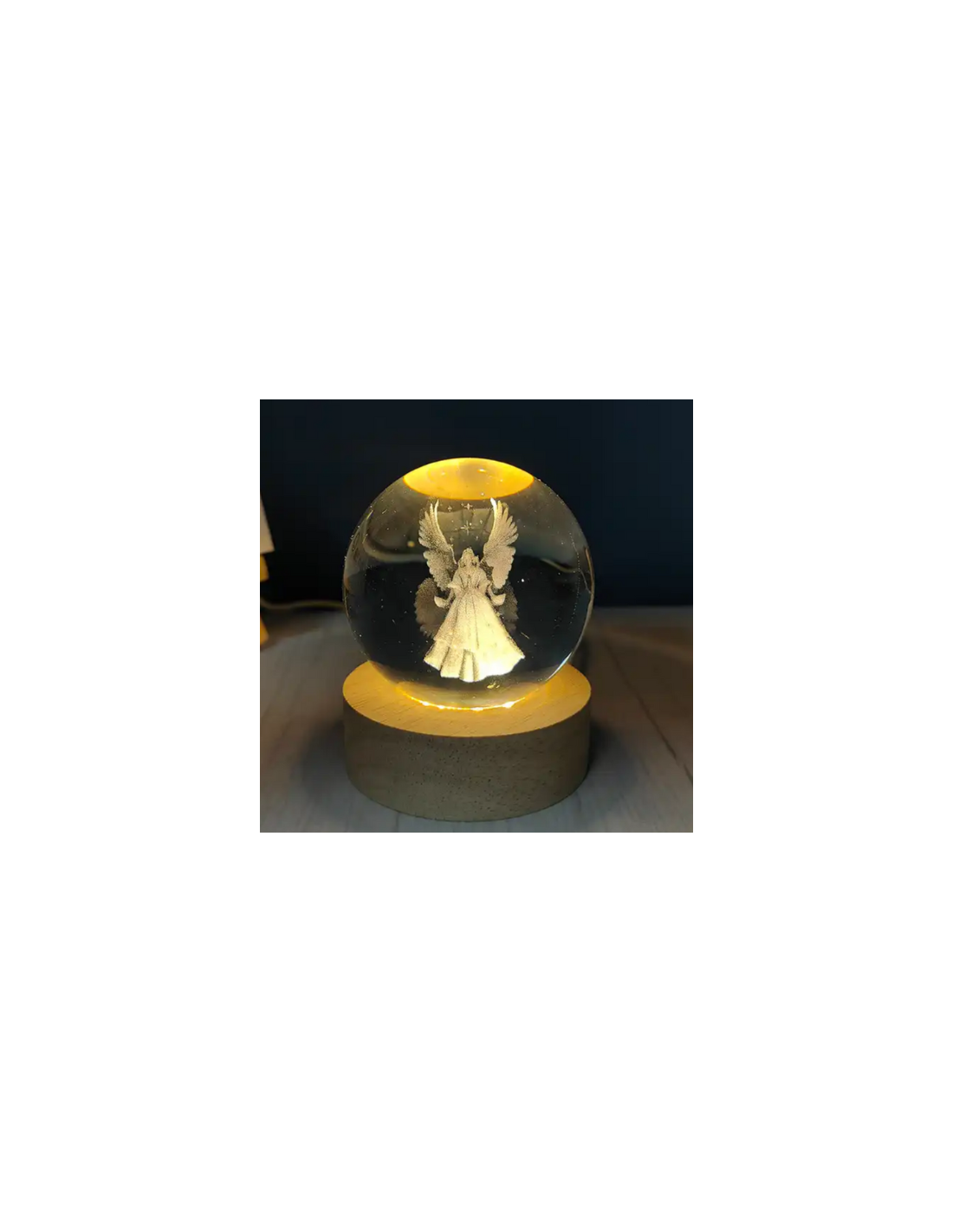 La lampada presenta una base in legno pregiato che dona un tocco caldo e accogliente. La sua sfera di vetro, con un diametro di 6 cm, raffigura delicatamente un angelo, simbolo di protezione e benevolenza celestiale. La luce soffusa emessa dalla lampada a LED crea un'atmosfera tranquilla e serena, trasmettendo un senso di pace e armonia.
