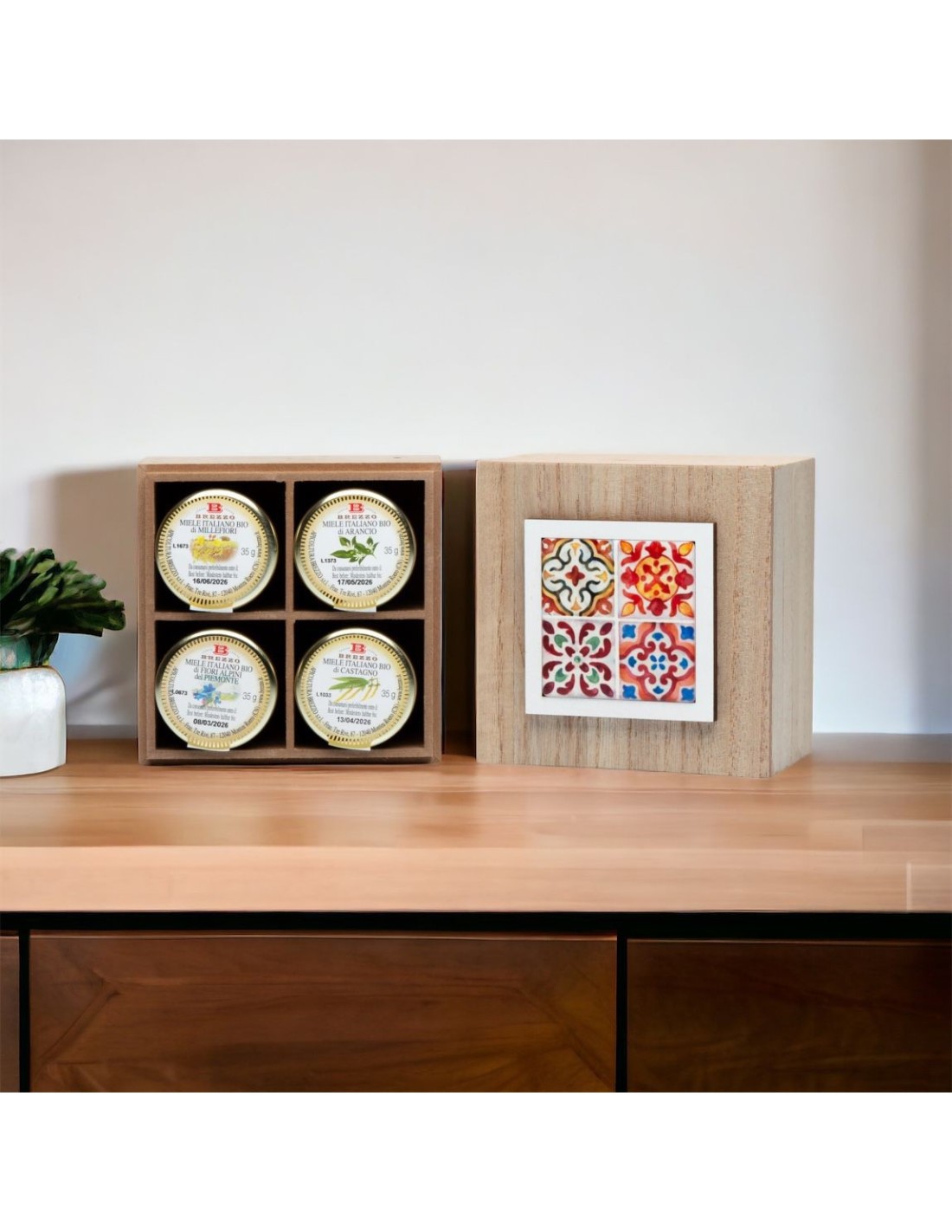 Bomboniera gastronomica set degustazione di 4 tipi di miele in confanetto in legno maioliche