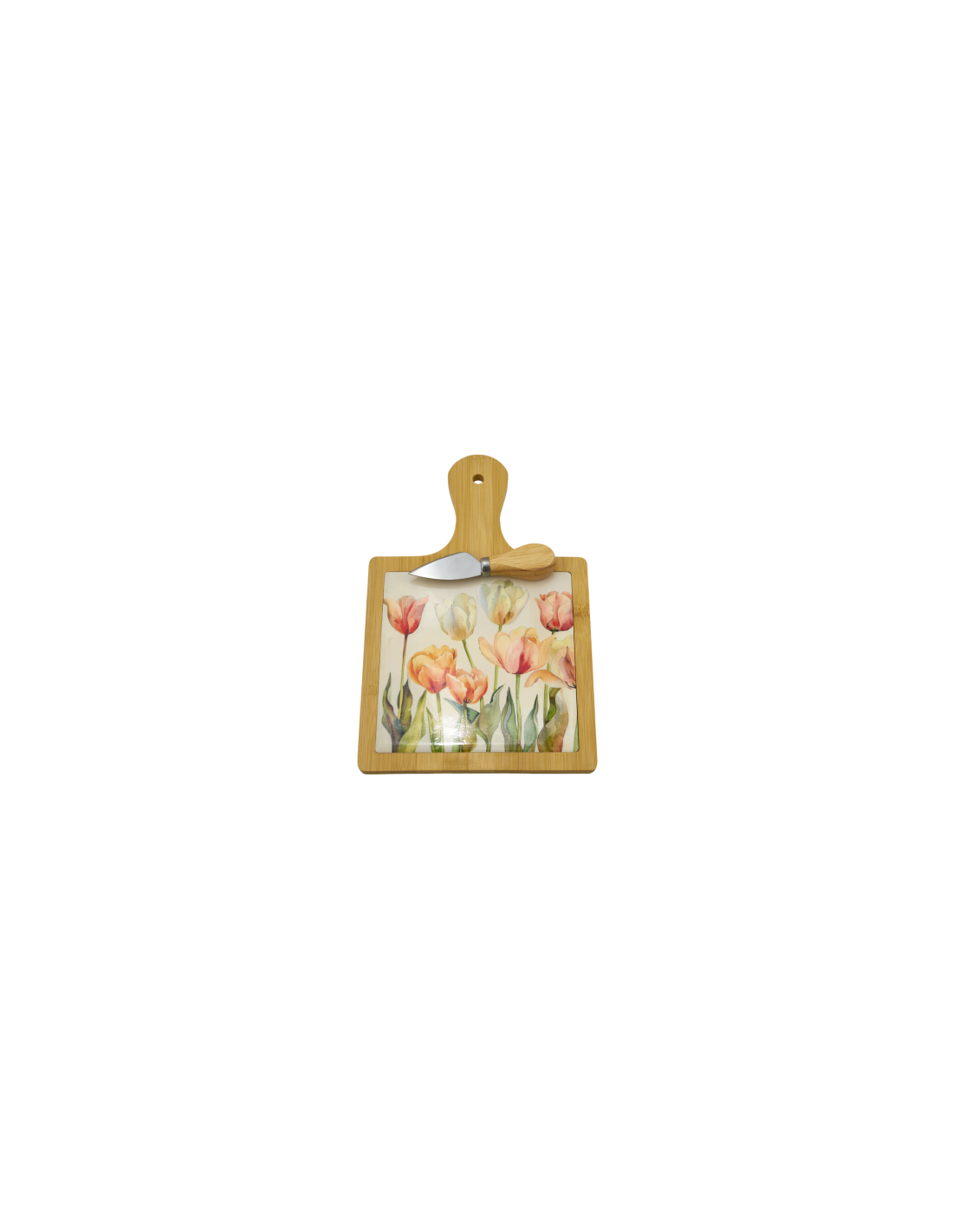 La fantasia di tulipani, simbolo di bellezza e freschezza, aggiunge un tocco di raffinatezza e colore al design. Ogni tagliere è rifinito con cura per garantire un oggetto di alta qualità che durerà nel tempo. Il legno, un materiale resistente e naturale, conferisce un aspetto rustico e accogliente, rendendo questo tagliere ideale per ogni tipo di arredamento.