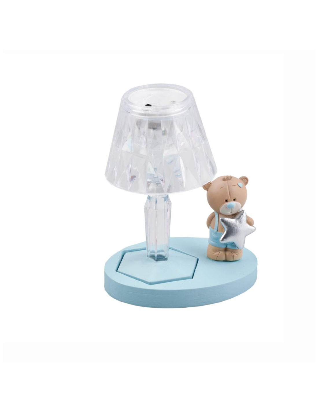 Una tenera lampada LED con base azzurra e un dolcissimo orsetto che stringe una stella color argento, simbolo di sogni e tenerezza. Con i suoi 11,5 cm di altezza, diffonde una luce calda e rassicurante, perfetta per la cameretta di un bimbo. Ideale come bomboniera, regalo nascita o battesimo, questa lampada unisce dolcezza, eleganza e funzionalità. Un ricordo luminoso che scalda il cuore e accompagna i sogni più belli.