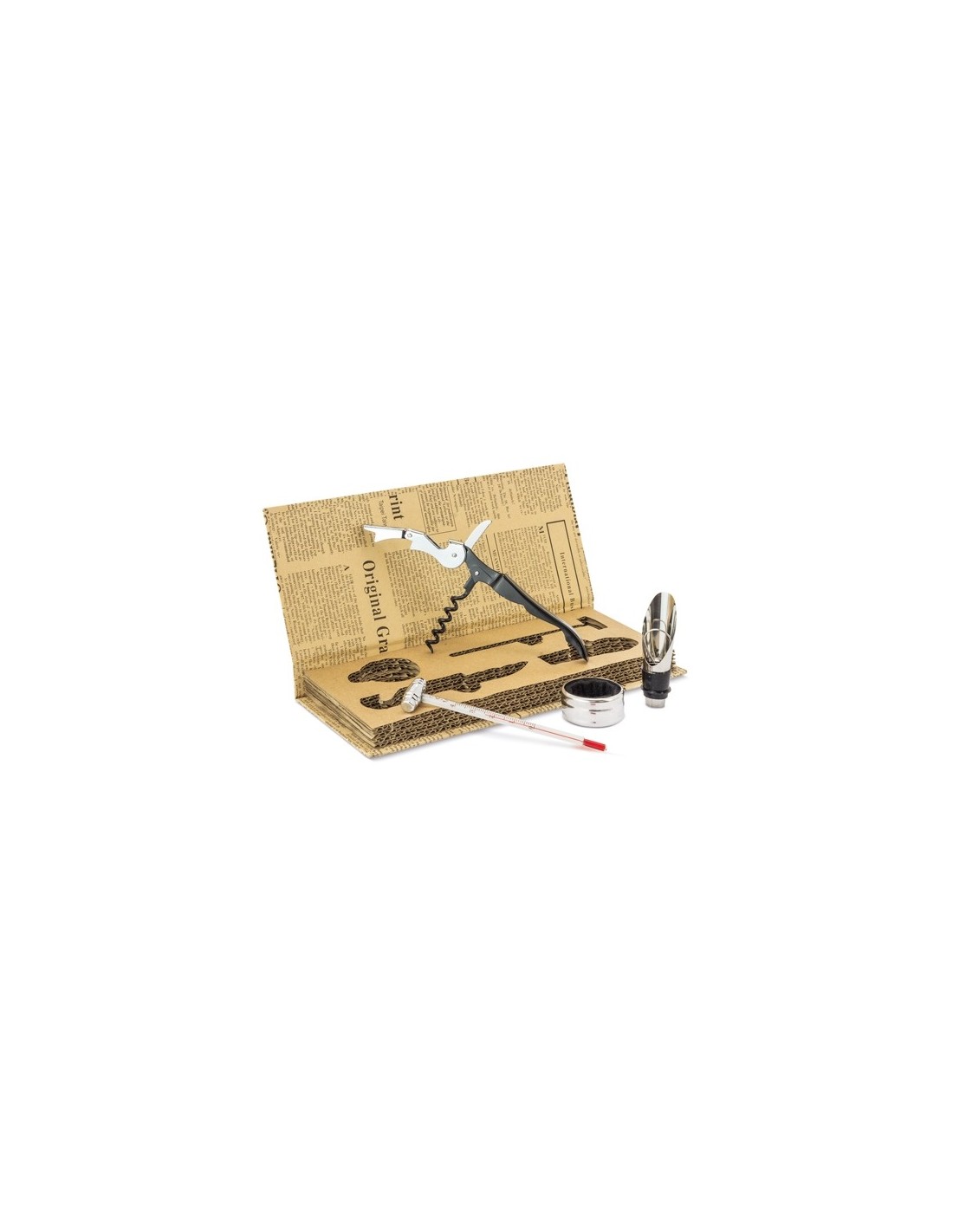 Questo Set Vino Completo in Stile Vintage è la bomboniera ideale per chi cerca un regalo utile, ricercato e dal forte impatto visivo. La confezione, studiata come un libro decorato effetto carta stampata, si apre rivelando quattro accessori professionali per gli amanti del vino: