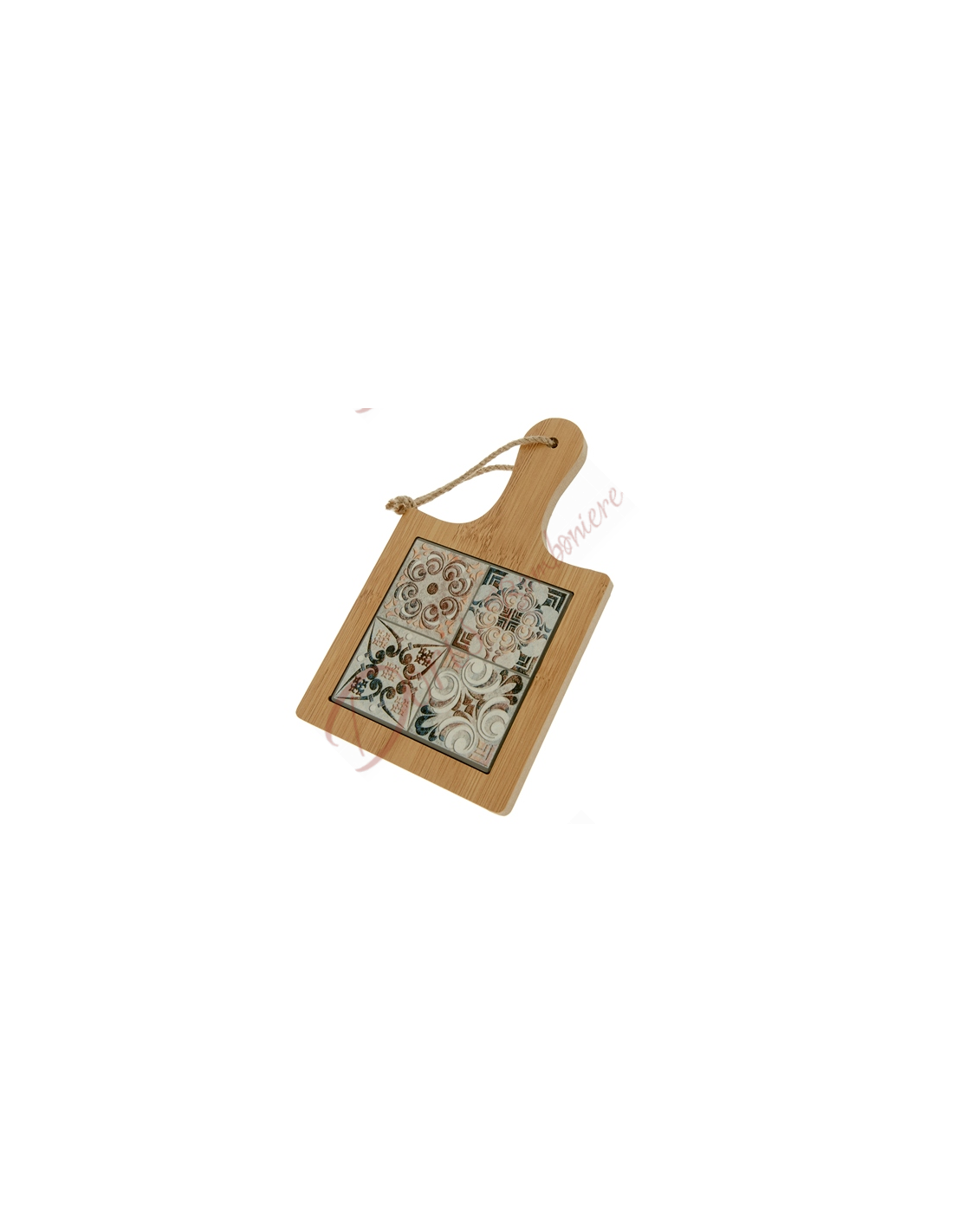 Utile tagliere da cucina con manico parte in legno e ceramica fantasia pompei.