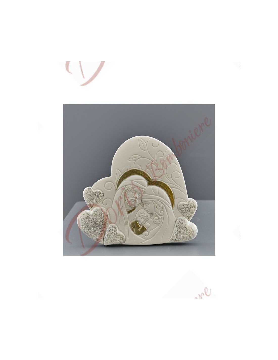 Colore principale bianco con dettagli in oro, la bomboniera oltre la sacra famiglia raffigura dei cuori simbolo di amore