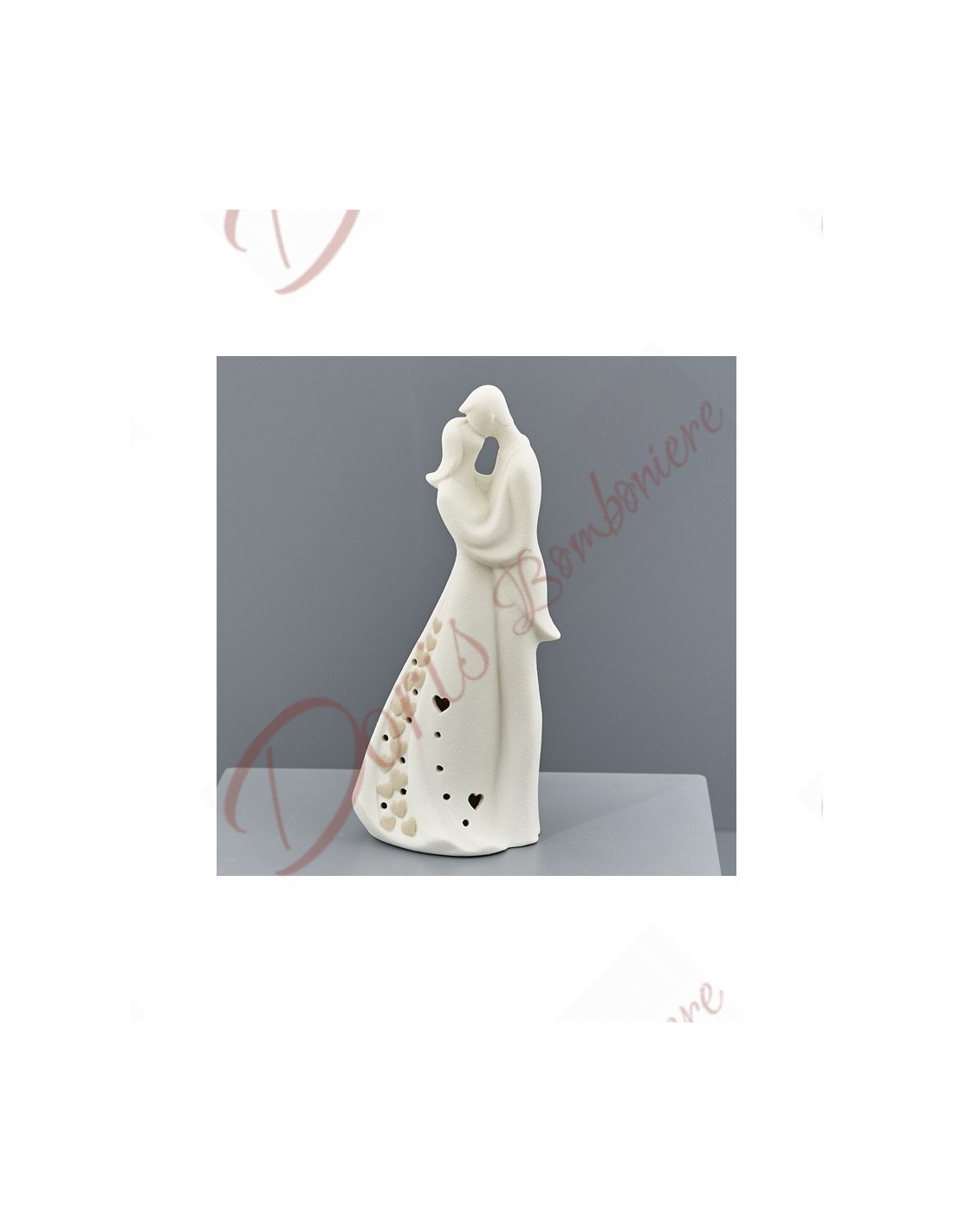 Eleganti bomboniere per matrimonio, coppia di sposi innamorati con bacio in ceramica ruvida, dai loro fori a forma di cuore riportati sulla base andando verso la parte centrale della statua, fuoriesce all'accensione una fantastica luce.