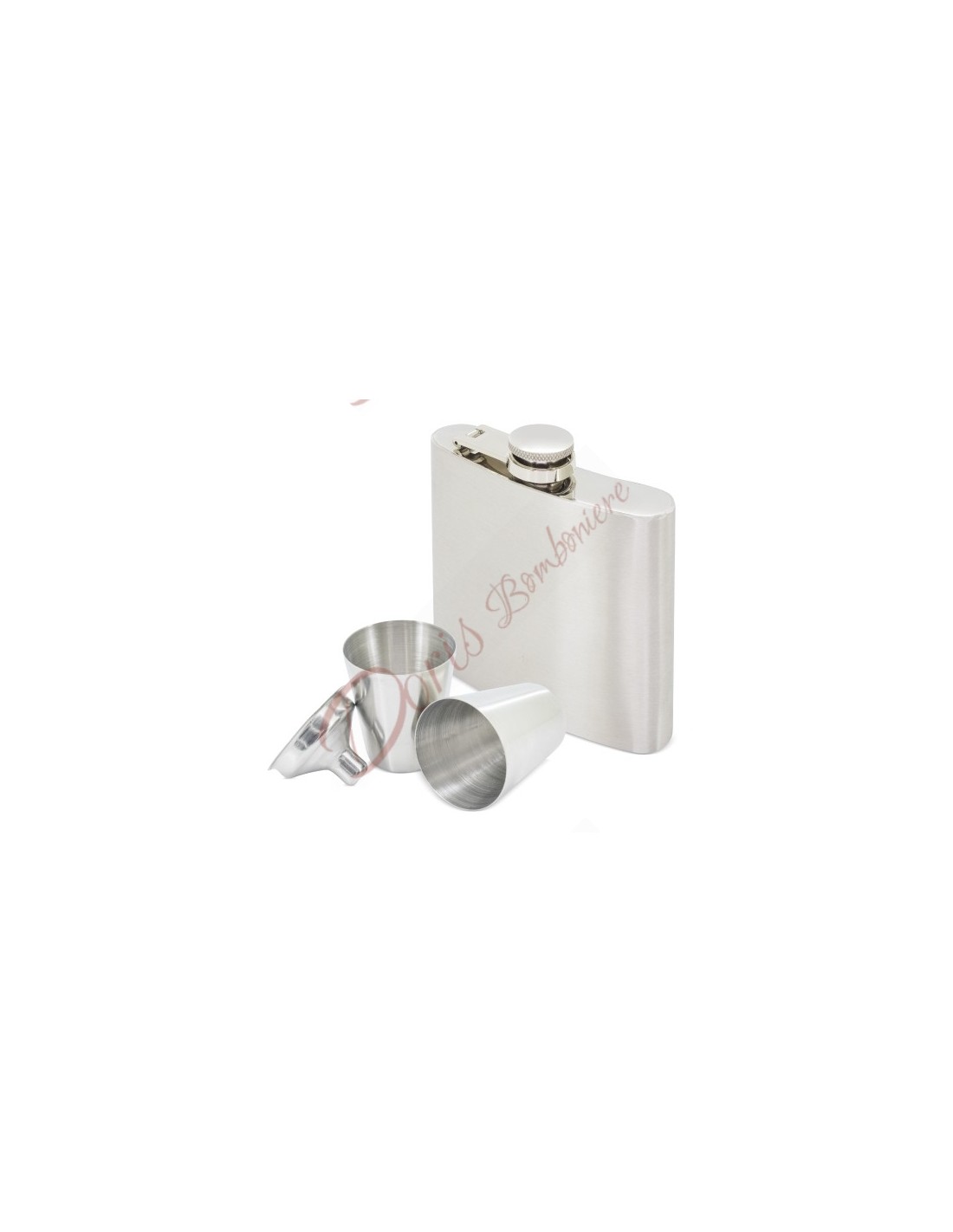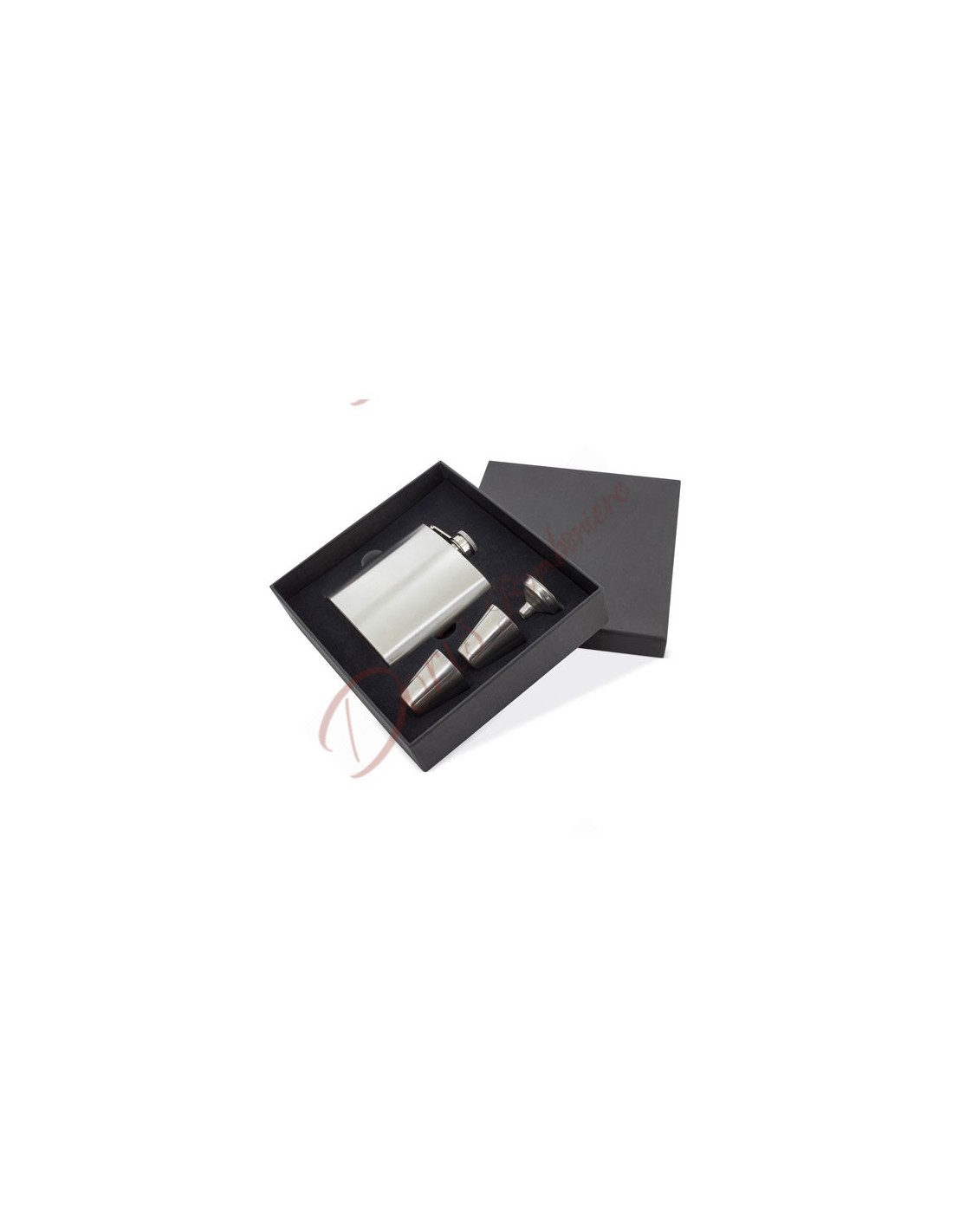 Set con scatola come da immagine con boccetta per liquore tascabile e 2 bicchierini realizzati in acciaio inossidabile.