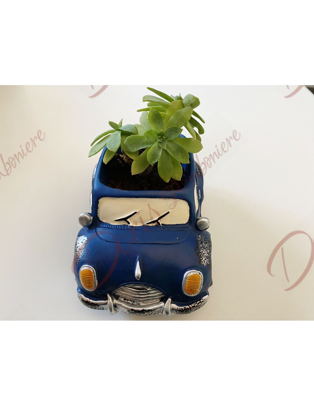 Rendi indimenticabili i tuoi eventi speciali come battesimi, comunioni e cresime con la nostra eccezionale bomboniera macchina blu a forma di vaso porta pianta. Questa bomboniera unica cattura l'attenzione grazie al suo design vivace e giocoso, che aggiunge un tocco di colore e allegria alla tua celebrazione.